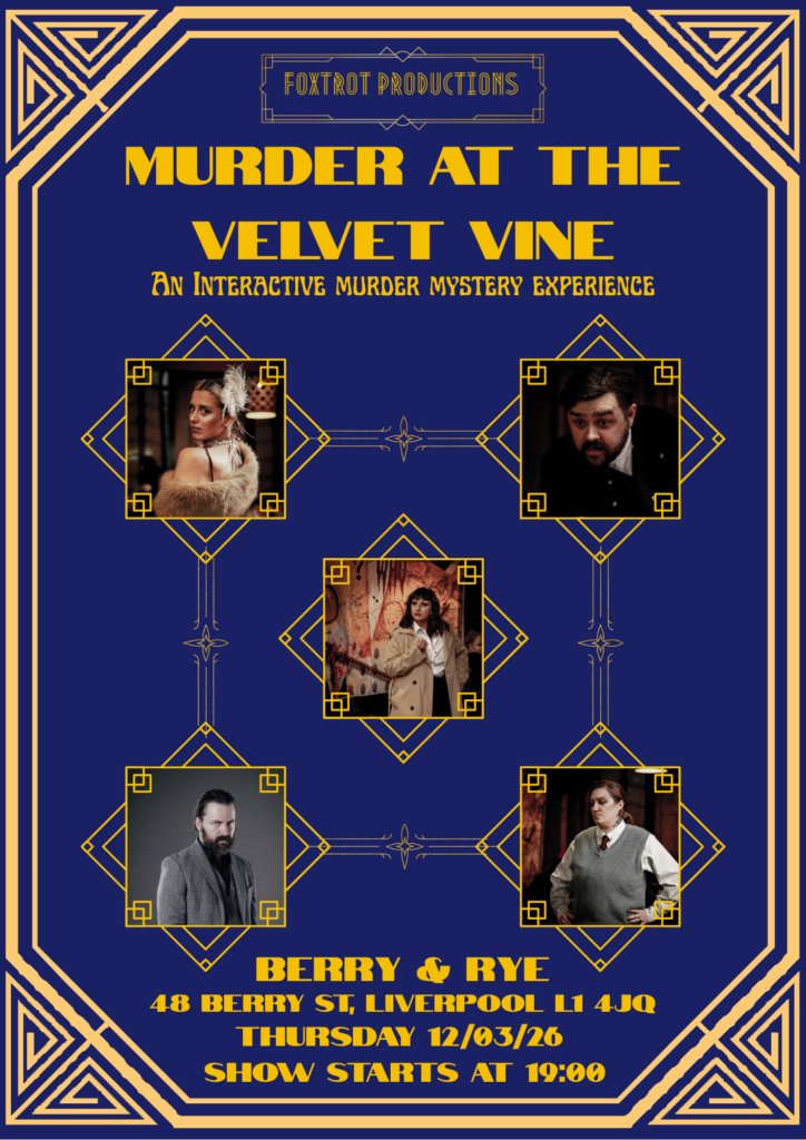 Foxtrot Productions is bringing their classic noir murder mystery experience “Murder at the Velvet Vine” to Berry & Rye. Join us for a night of interactive theatre and immersive fun.