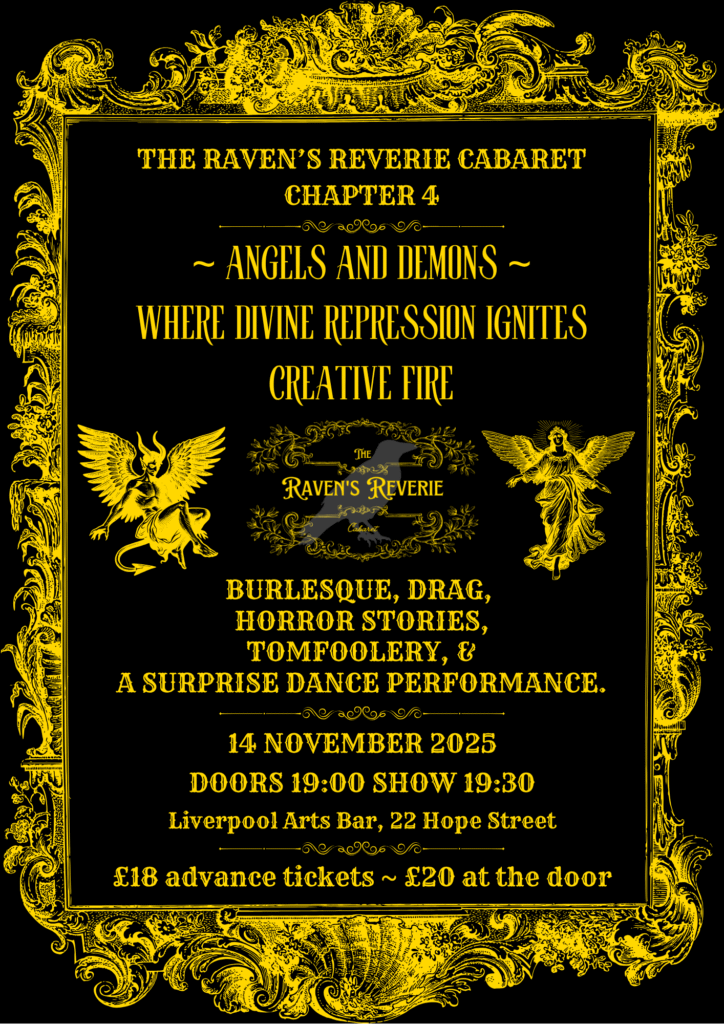 Expect dark, seductive burlesque, gritty dance moves, unsettling drag acts, and any other variety act that intrigues the Raven as she is writing the story of the next cabaret.